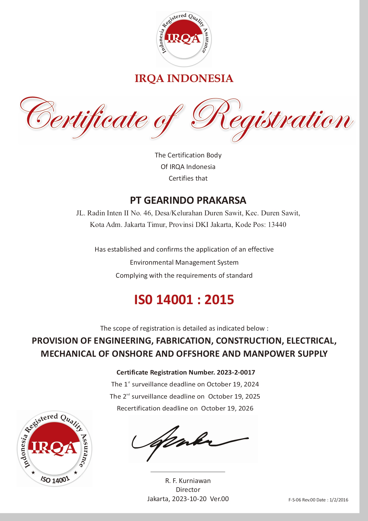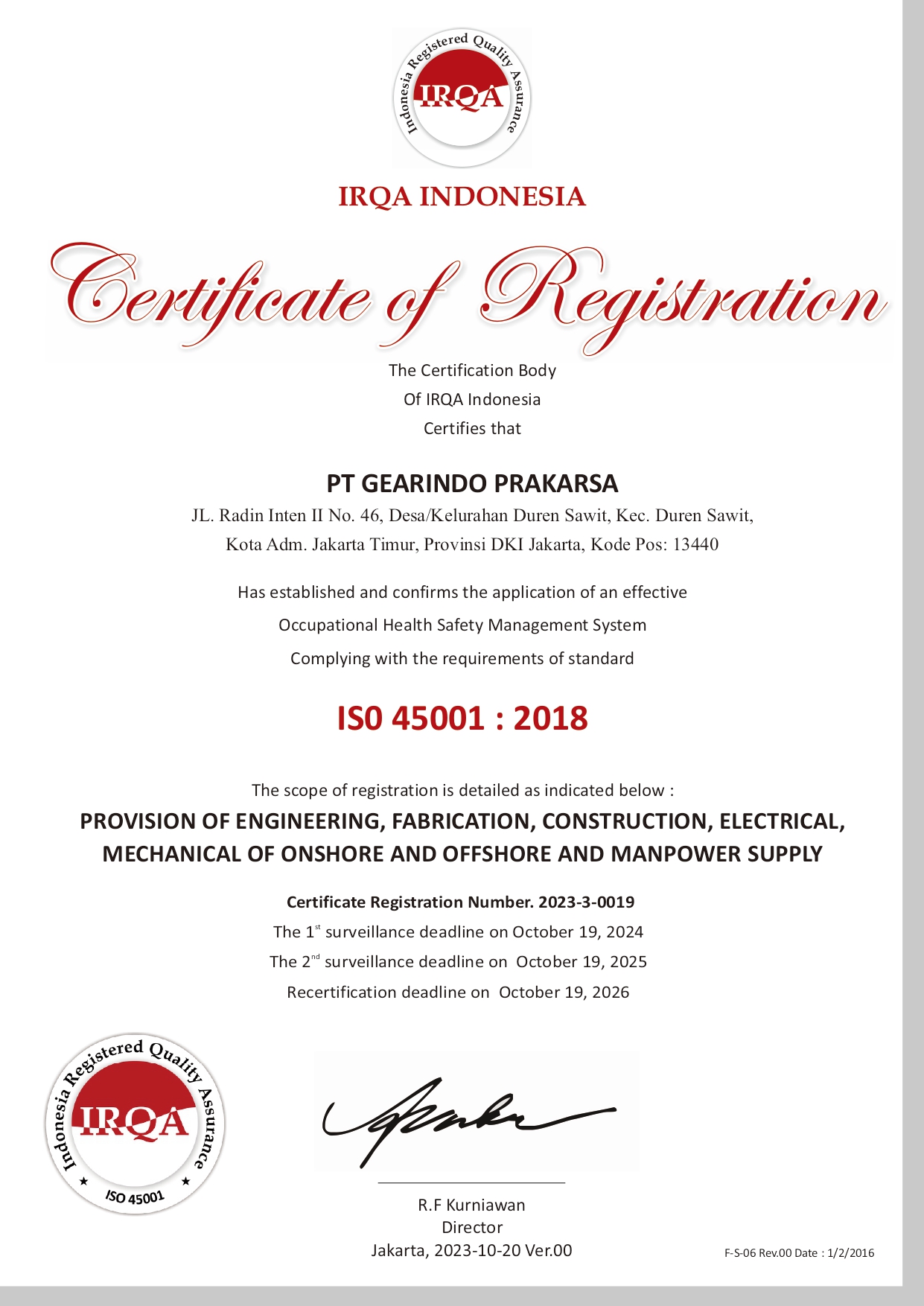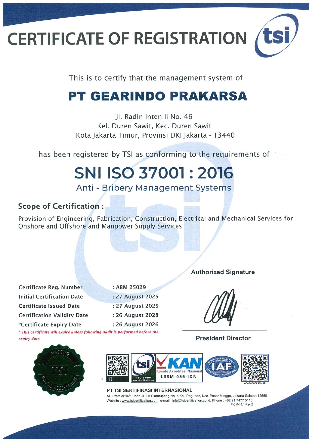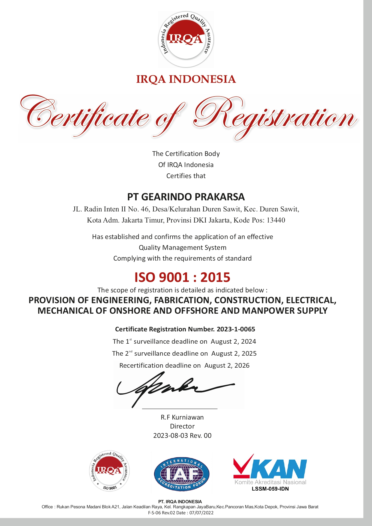 PT. Gearindo Prakarsa is a national private-owned company with head office located in Duren Sawit, Jakarta. Established in 1993, currently PT. Gearindo Prakarsa employs more than 500 personnel throughout Indonesia. Its fabrication area is located in Desa Tamansari Kecamatan Setu – Cibitung and in Margomulyo – Surabaya.