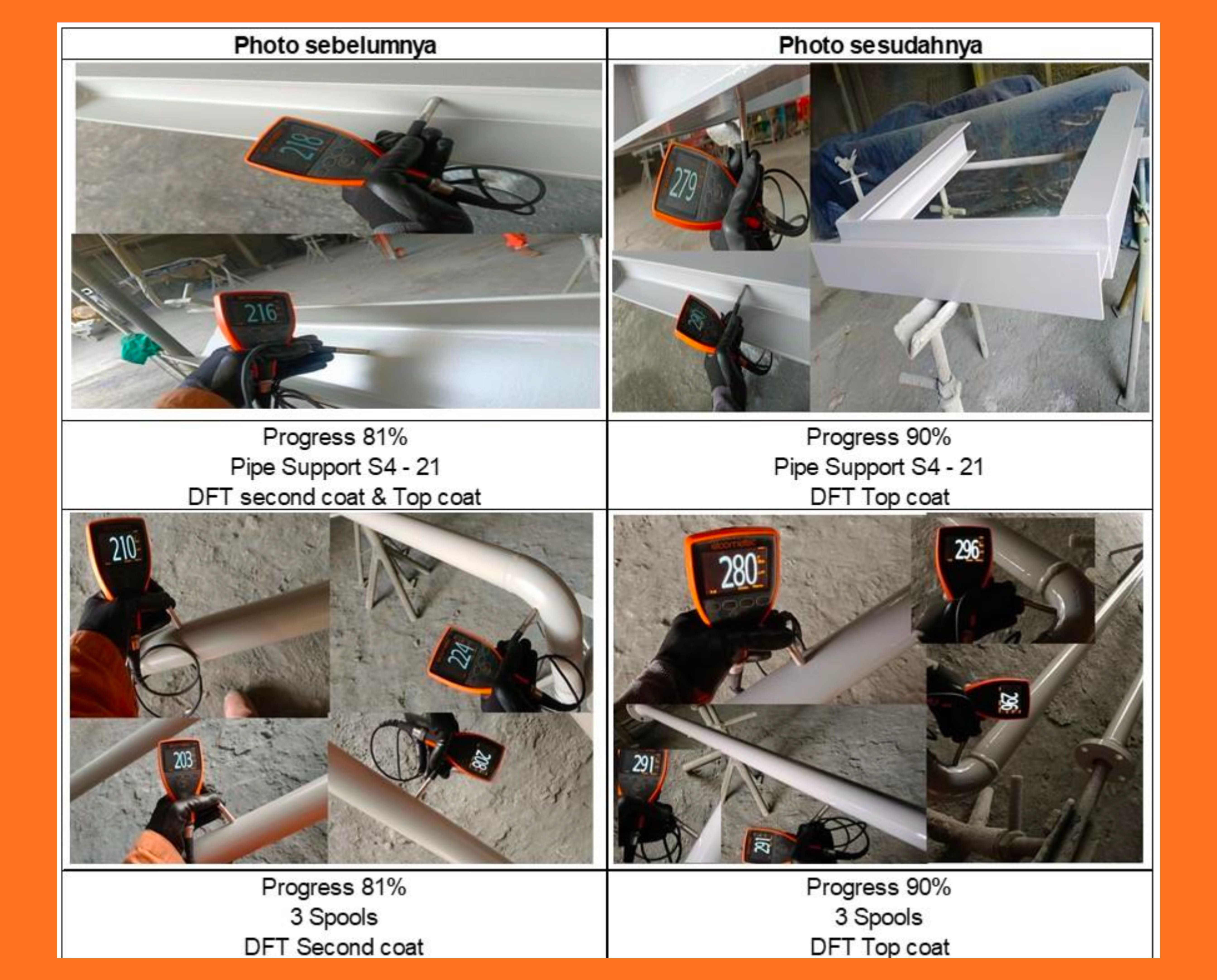 Following the successful fabrication and hydrotesting phases, the components moved to the corrosion protection stage. This process included blasting and the application of a multi-layer coating system: primer, second coat, and a final top coat in Grey RAL 7004, per technical specifications. Dry Film Thickness (DFT) measurements were conducted at every stage to guarantee material durability in extreme environments.