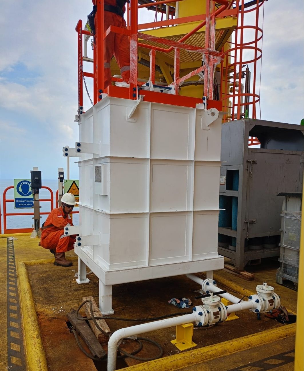 The rectangular tote tank was meticulously fabricated at our Bekasi workshop, adhering to the rigorous ASME Section VIII Division 1 standards. Constructed using high-grade 316L Stainless Steel, the unit is engineered to withstand the demanding corrosive environments of offshore operations.