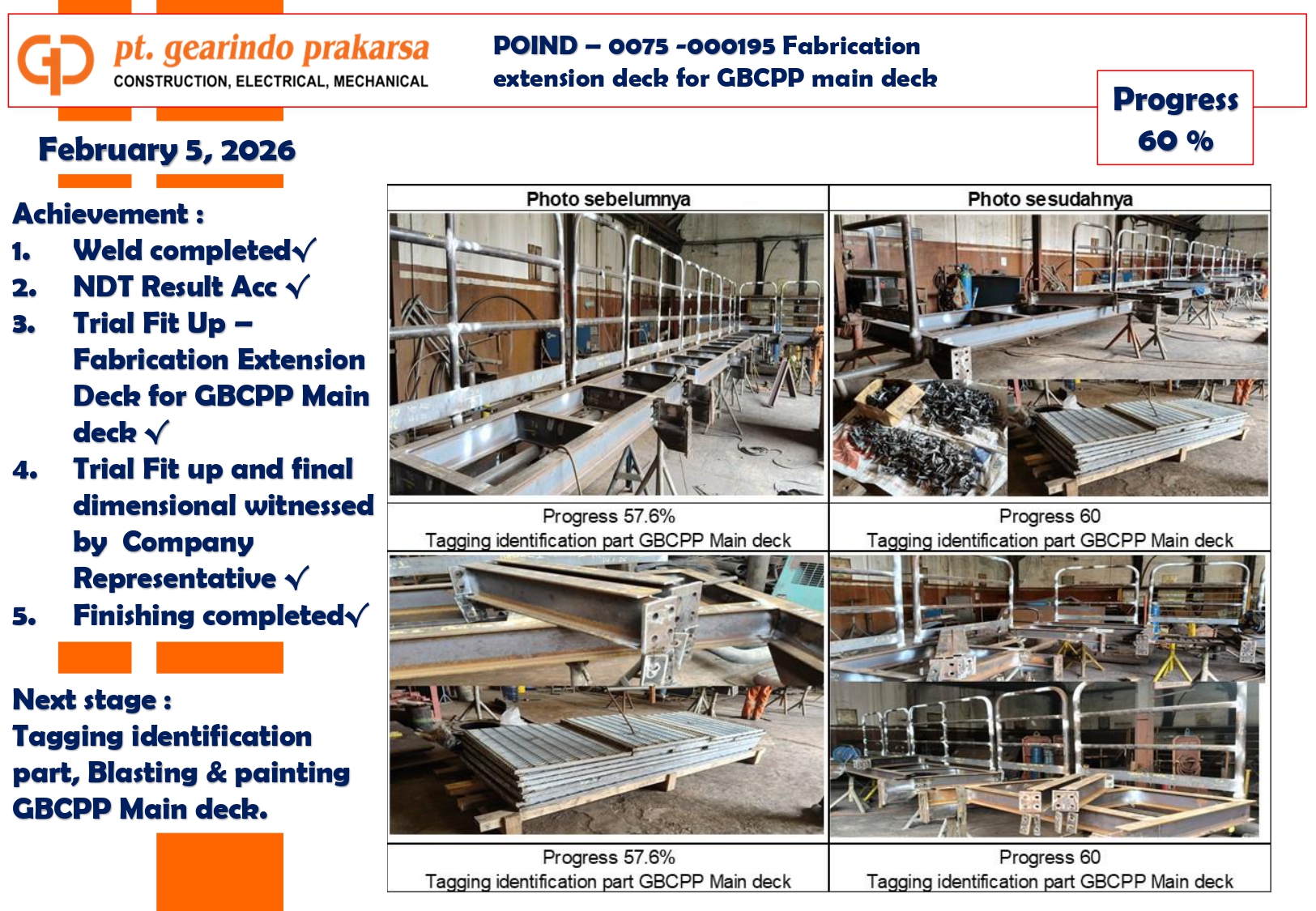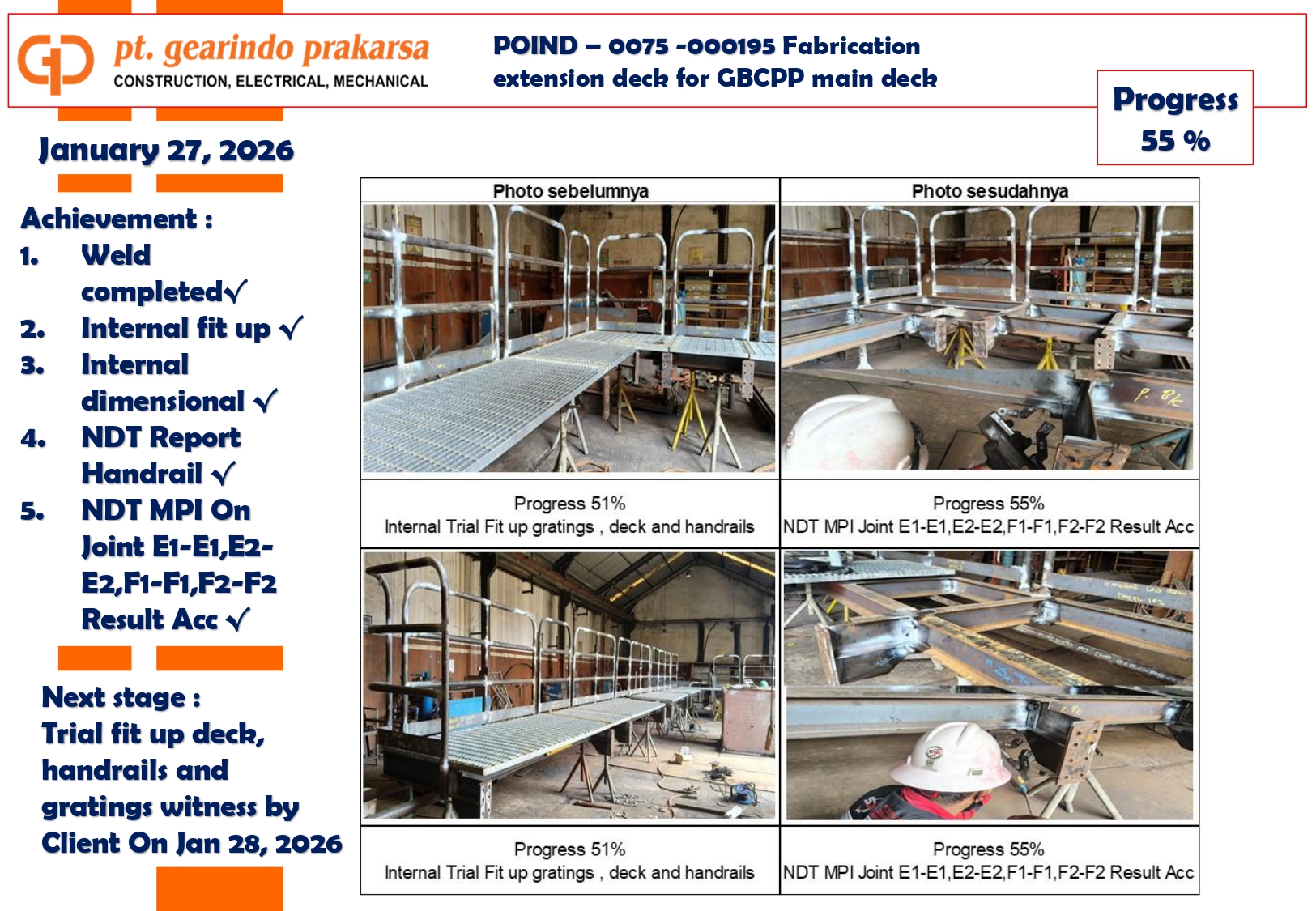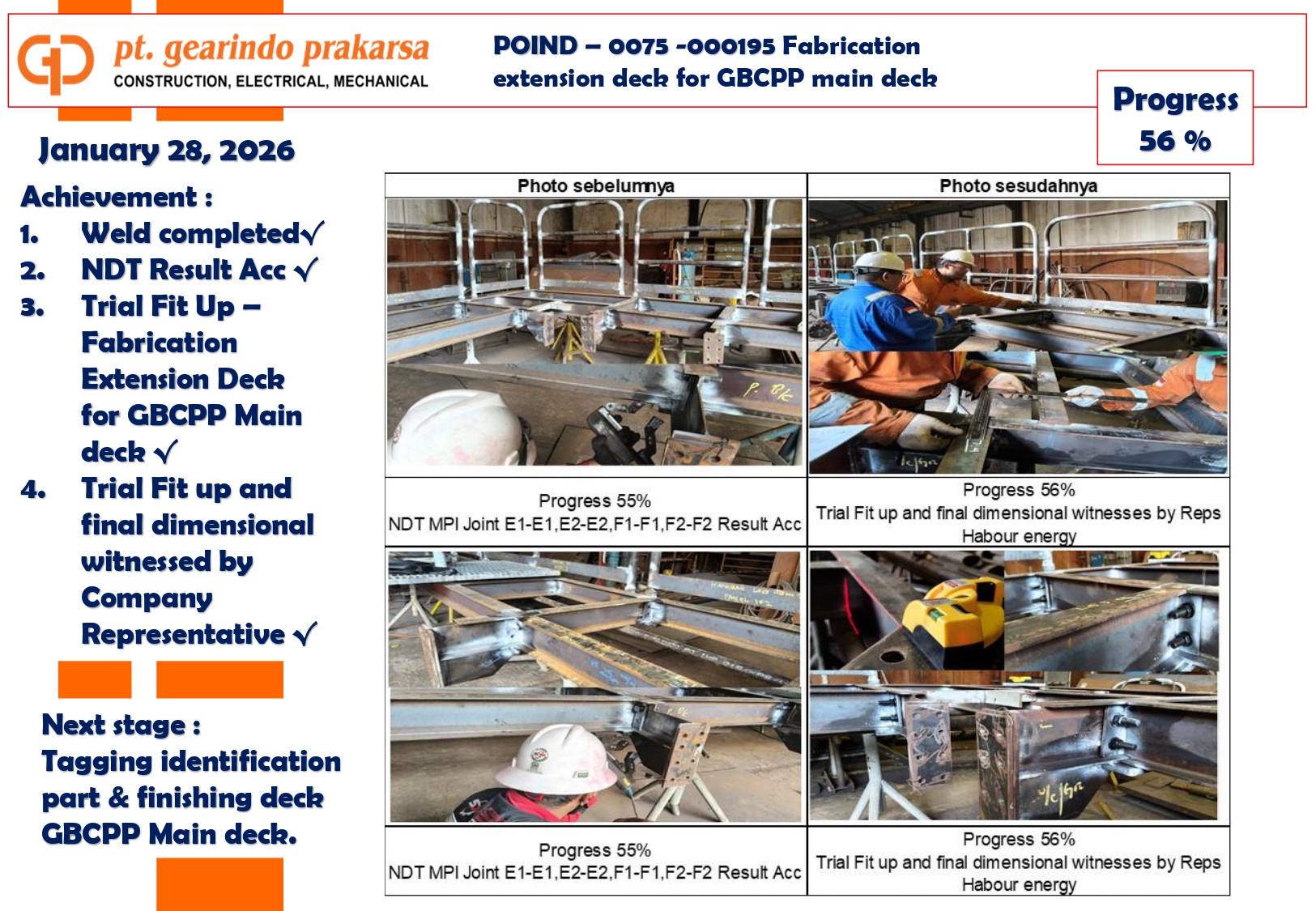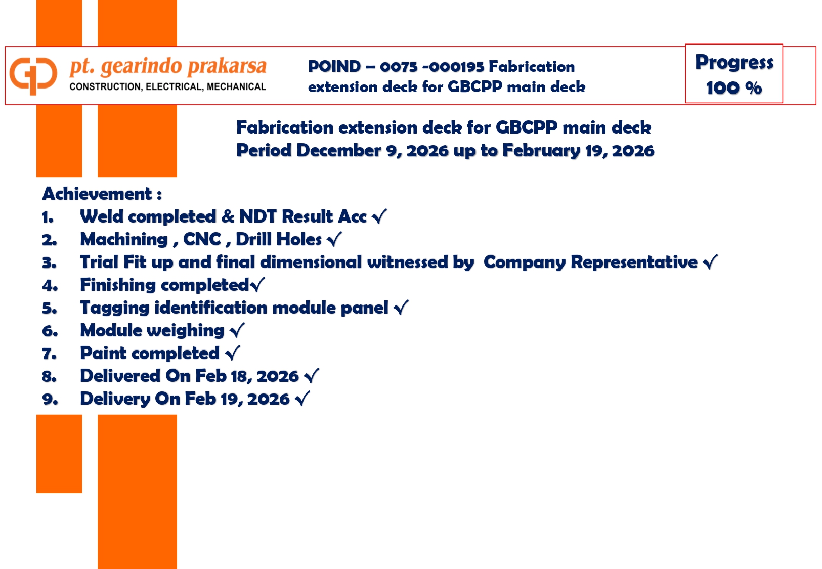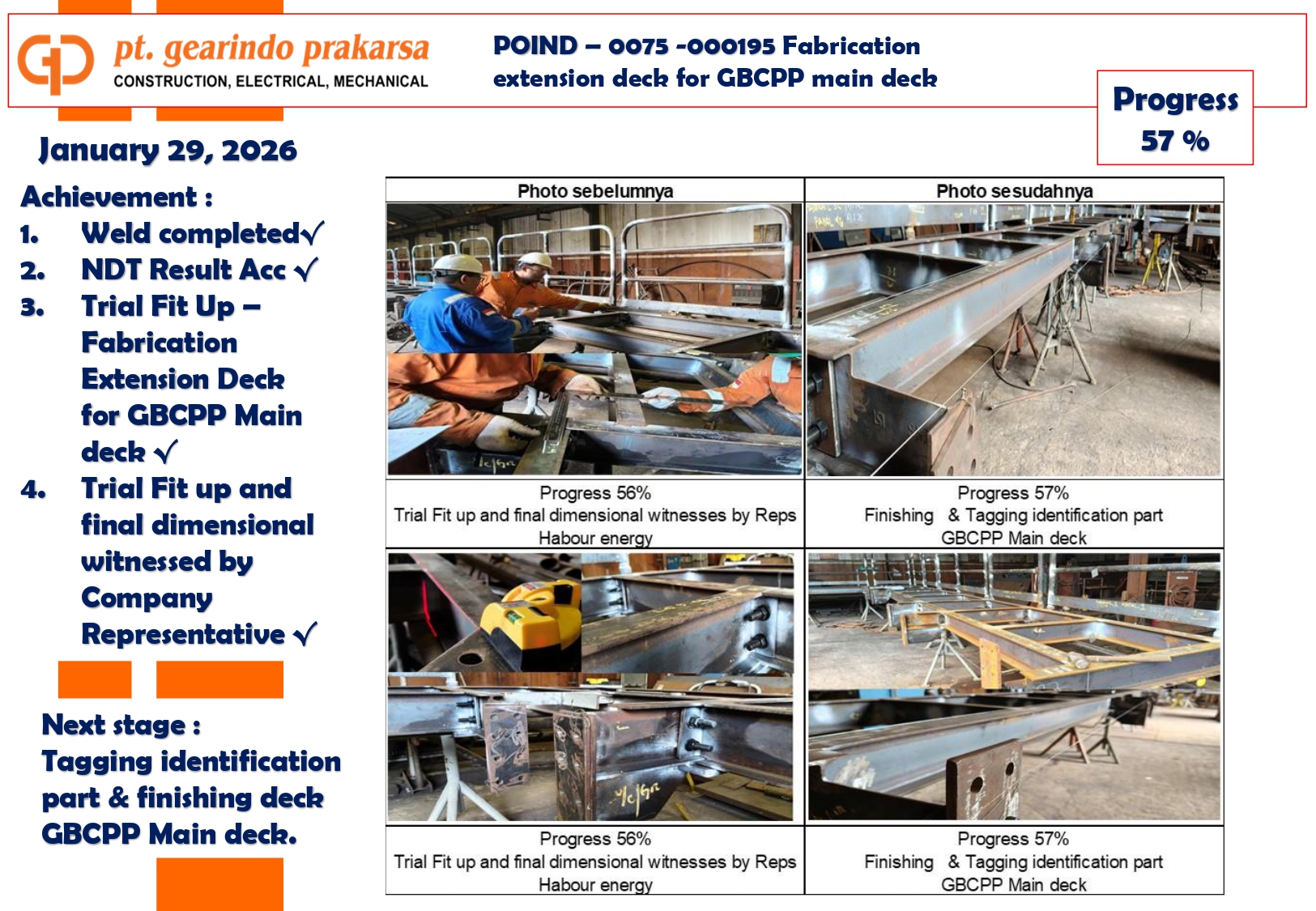 These achievements are a direct reflection of PT Gearindo Prakarsa’s Vision, Mission, and Core Values (GEARS). By combining advanced technology with disciplined project management, we continue our mission to be a trusted partner in the energy sector—consistently delivering high-quality services that prioritize technical excellence, safety, and customer satisfaction.