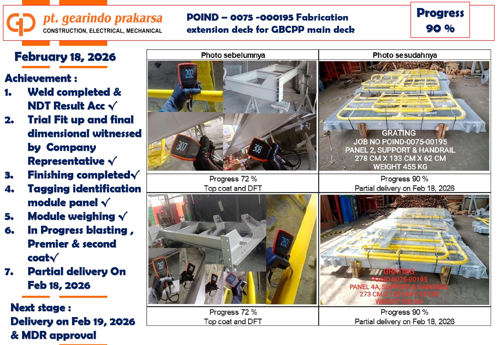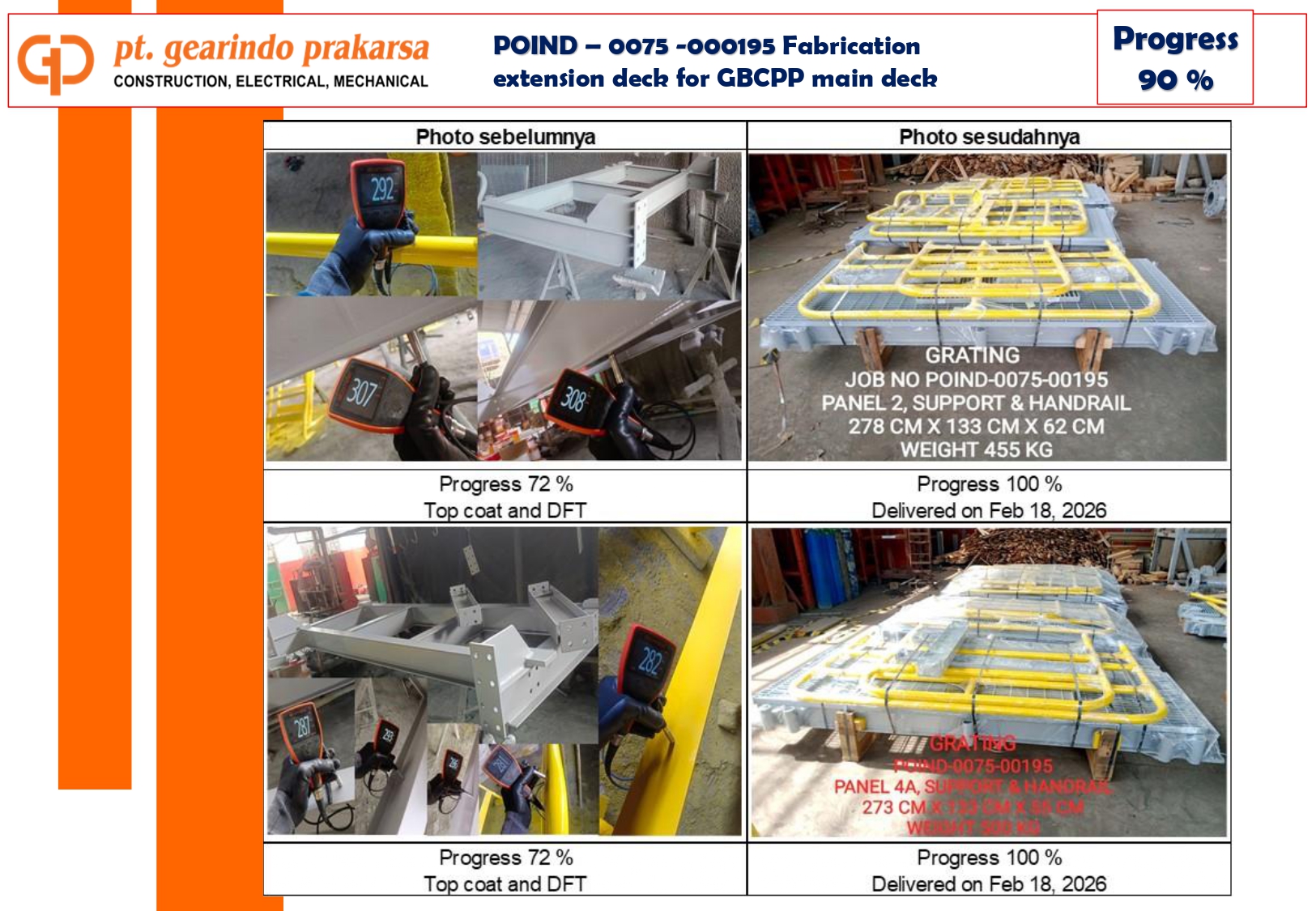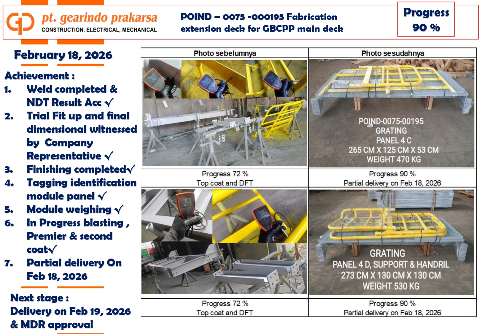 - Deck Panel Weighing: Accurate weighing and dimensional data for each panel (e.g., Panel 4C at 470 kg, Panel 4D at 530 kg) were provided to the client to facilitate safe lifting and installation at the site.