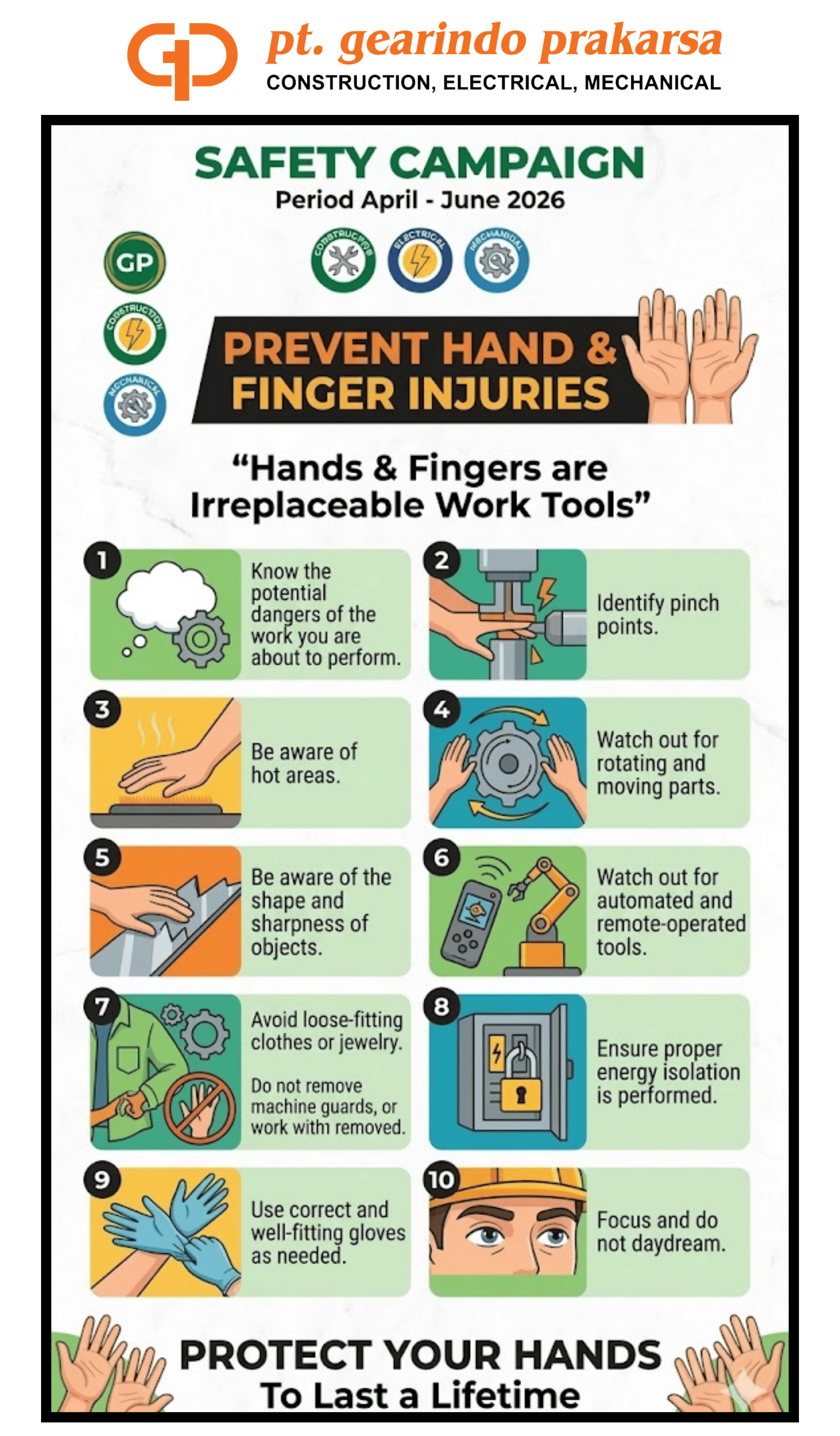 The core message of this campaign is simple: “Hands & Fingers are Irreplaceable Tools”. While we can repair machines and replace equipment, we cannot replace the biological precision of our hands. This campaign is designed to increase awareness among all employees—especially those in high-risk technical fields—about the daily hazards that threaten their physical well-being.