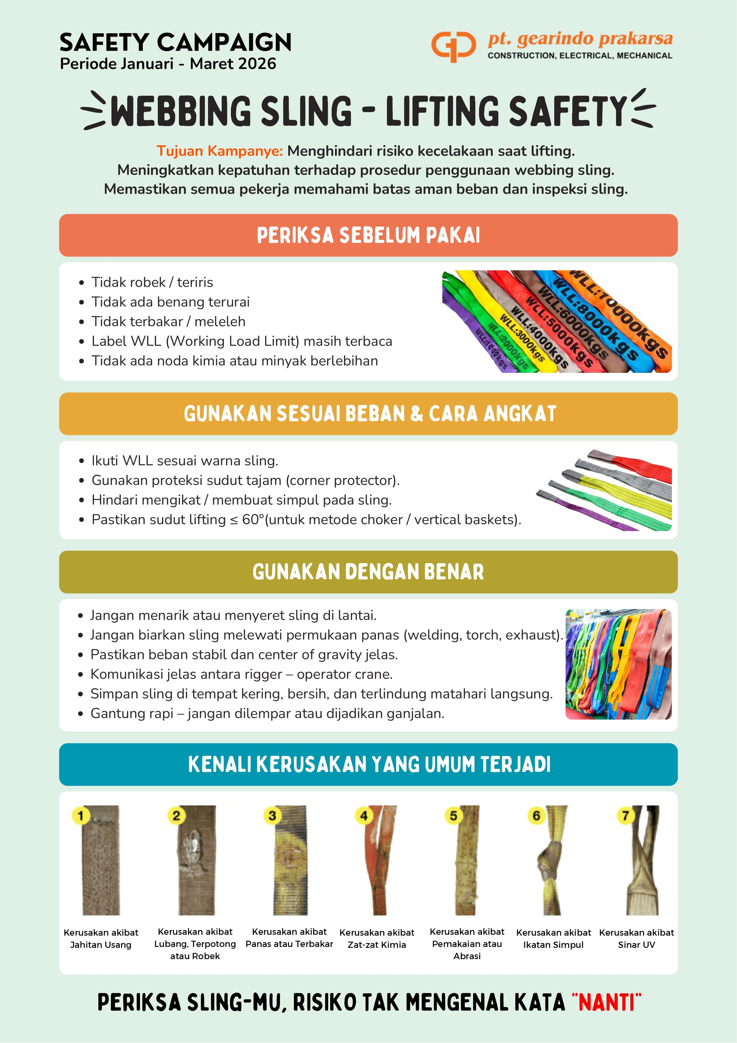 At PT. Gearindo Prakarsa, safety is not just a priority; it is a core value that guides our every move in our daily operations. For the first quarter of 2026 (January – March), we are launching a dedicated Safety Campaign on Webbing Sling Lifting to ensure every member of our team returns home safely.